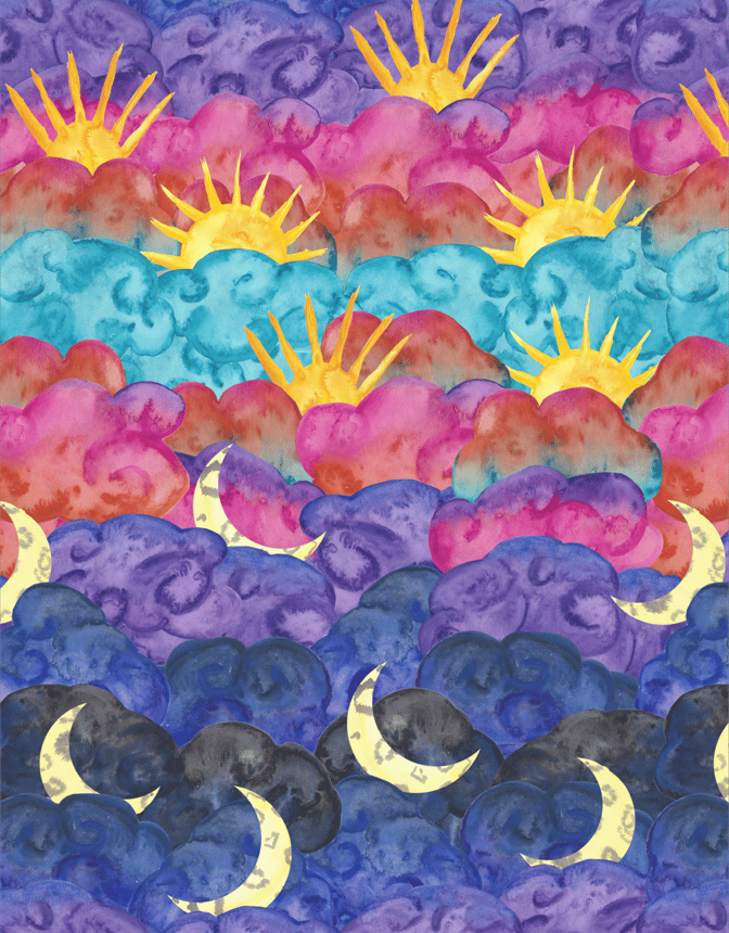 This print was originally designed as a seamless pattern for a design contest. I hand painted each cloud, sun, and moon motif using watercolor and then digitally collaged the scanned painting elements. I've created many watercolor pattern designs this way, but this was my first time trying this technique while I was still very new to the world of pattern design. When I first started making prints of my work this was one of the first designs I wanted to see printed. I have always loved how the colors work with each other in this soft gradient, the whimsy of the swirls in the clouds. This piece makes me feel calm and happy and I've had so many wonderful conversations with others who have resonated with this piece in their own way including those, who like me, and struggled with insomnia. The gentleness of this piece holds a lot of feeling for me, not just in when it was created but for what it has become as I experience other peoples view of it.