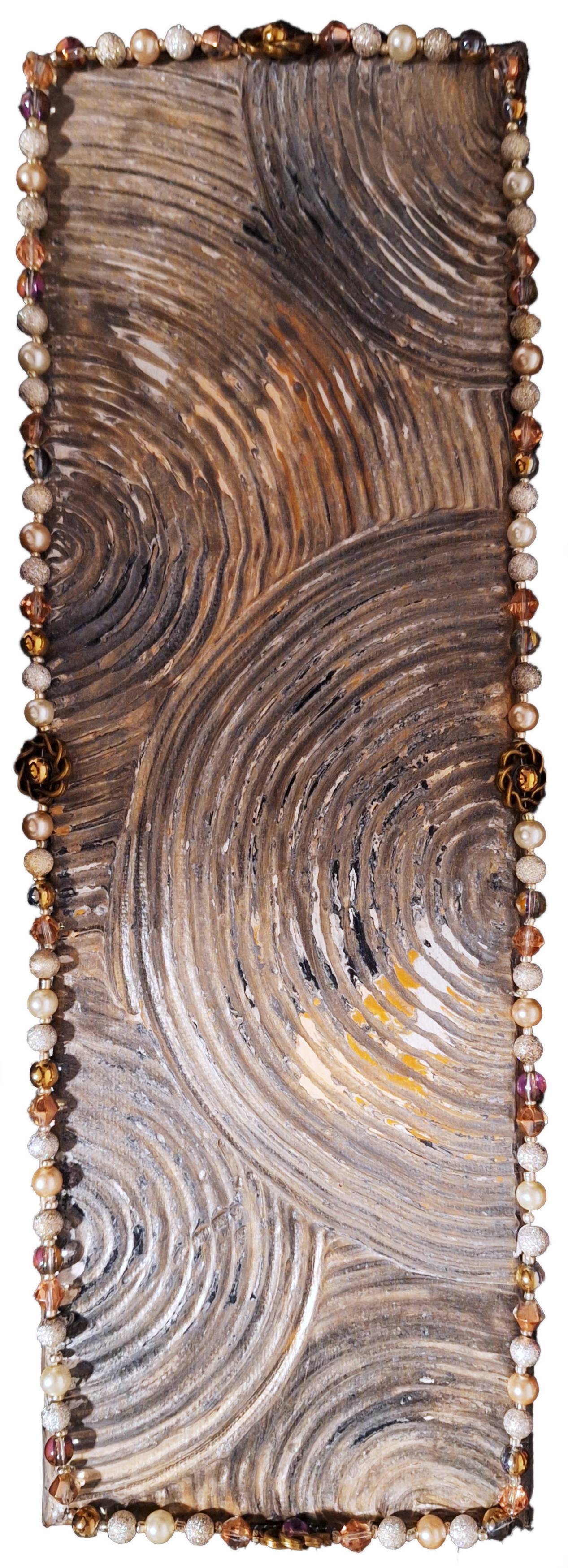 A new piece in my collection this piece is an experiment in texture and mixed-media. Mush of my work is highly pigmented and using a large variety of color. It is rare that I create anything muted or monochrome. I wanted to create a piece full of visual interest without the aid of color. The textured acrylic is a mix of white, black, grey, silver, and gold tones layered repeatedly over each other and then pulled through into ripples using a curved edge tool. The layers of paint were then scrubbed away in sections revealing the dynamic layers below adding a grunge inspired look to the modern piece. Beadwork has always been a special passion of mine, beginning farther back than my painting journey. Adding a frame of beads adds additional eye catching texture, that catches the light creating different effects, as well as adding an elegant "found object" feel. |