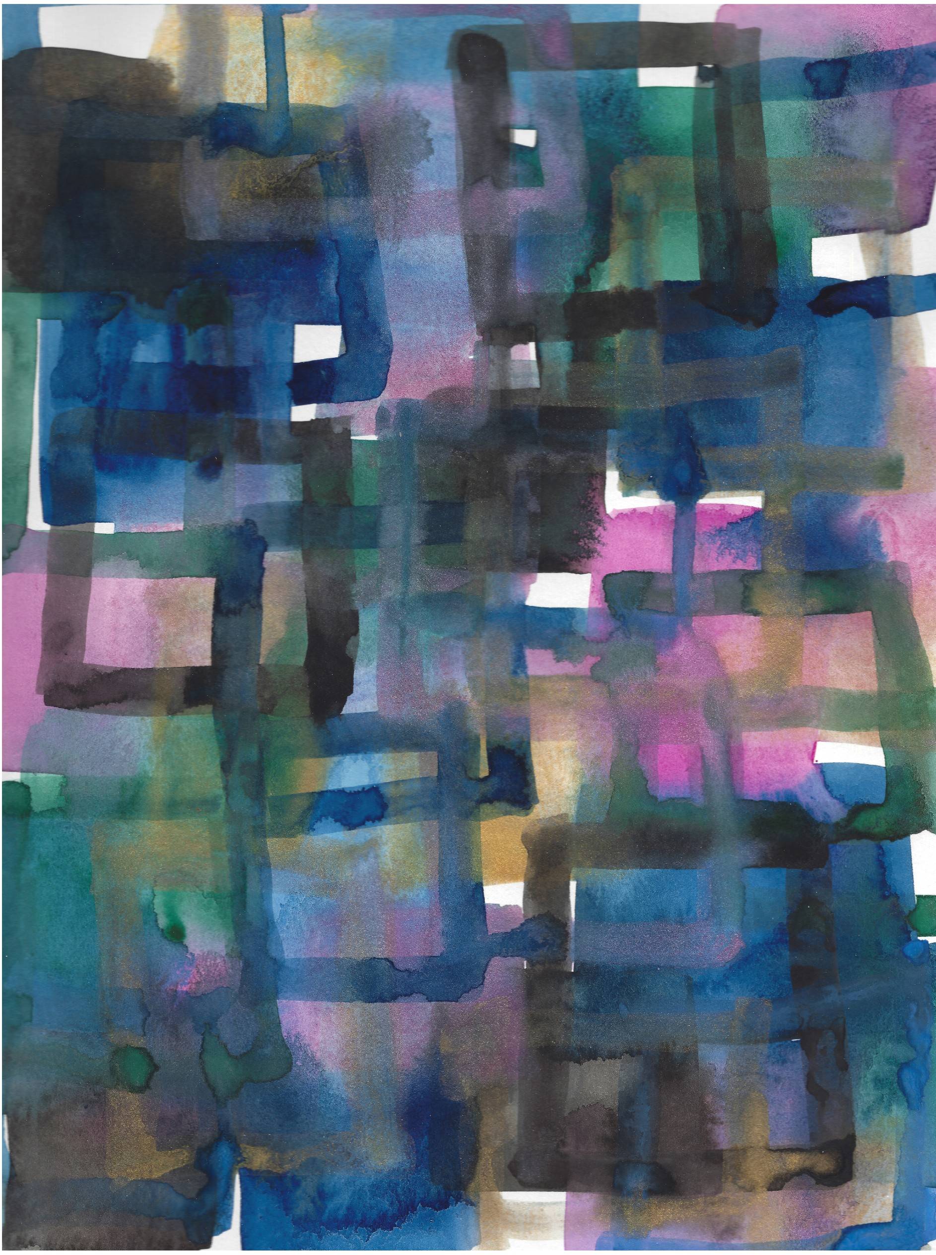 This is one of my early pieces that I created when I first started experimenting with abstract watercolors. This piece had previously been lost but was recovered last year when an old portfolio full of paintings turned up protected deep in storage like a small time capsule of my early work. This piece plays on the idea of "thinking outside the box" showing a series of squares and rectangles and squares overlapping and flowing into each other meant to represent ideas of non-linear thought and the brainscape of an overactive mind.