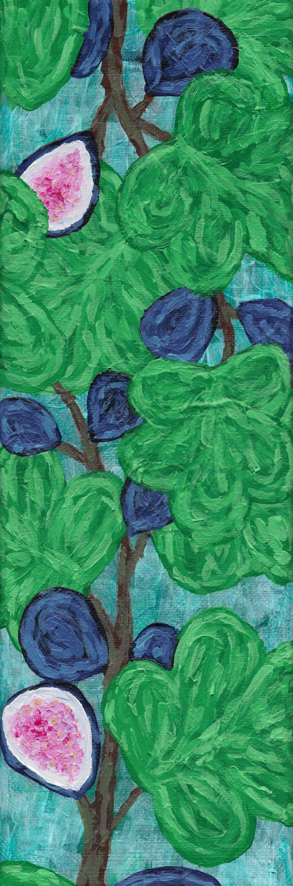 Lately I've started to paint more and more stylized and abstracted still life subjects. I enjoy using overt layered texture to create depth and character. These overlapping fig tree branches are a twist on the format of classic vintage botanical drawings and inspired by the dark blue-purple figs my grandmother has in her yard. The dark skin, vibrant pink fruit, the curving forms of the leaves, and textured brush strokes combine together to create a feeling of movement and soft romance.