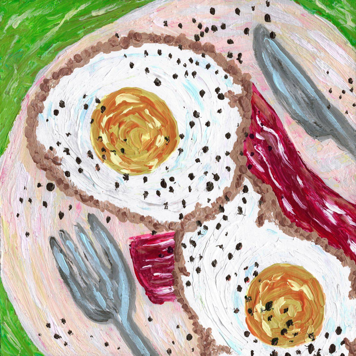 I've never been a big breakfast person, in the sense that I hate eating first thing in the morning. But I love breakfast food, particularly eggs. In my first year of university it became a standard breakfast that I'd have two fried eggs on toast with hot sauce. This become so regular that by the end of the year the very nice man who managed the griddle in the campus food hall knew my face and my order by heart, and if I strayed from my usual he'd ask if I was ok. But I'm very particular about my eggs. I love a soft yolk that oozes out once punctured but I need the white to be fully cooked. But when cooked right they're not only delicious but beautiful. This piece was one of my first stylized still life paintings and created entirely from memory without the use of reference images. As with my other stylized pieces my ode to eggs and bacon was not an attempt to paint realistic food, rather I wanted to capture a feeling. That feeling of staring down at a plate of perfectly cooked bacon and eggs on a Saturday morning and knowing that today is going to be a bright, happy day.